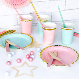 Papierowe talerzyki w kolorze jasnoróżowym ze złotymi metalizowanymi brzegami, średnica ok. 18 cm. (1 op. / 6 szt.)